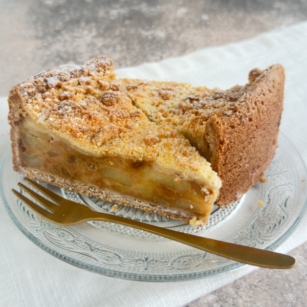 Taartpunt van harde wener deeg gevuld met appels en rozijnen. De bovenkant is afgewerkt met knapperige crumble.