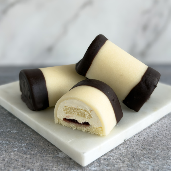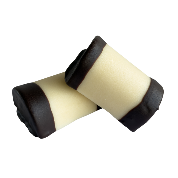 Onze grote mergpijpen bestaan uit crème met een vleugje rum, omringd door marsepein. In dit product zit een beetje alcohol.