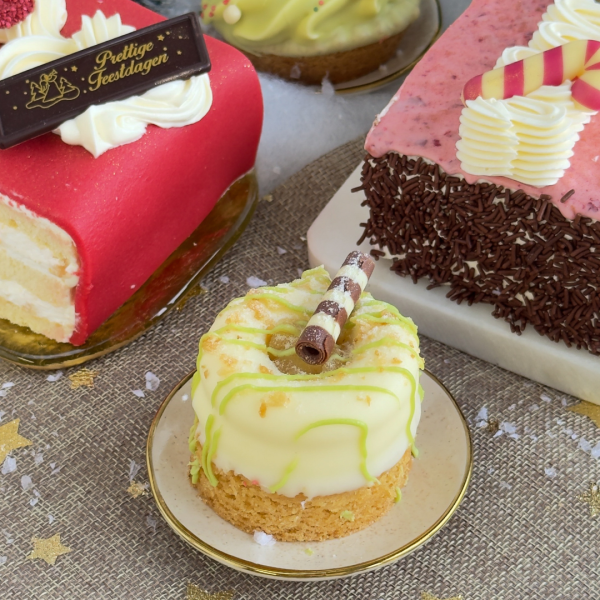 Ons klassieke koninkje gemaakt met een spijsbodem met een heerlijke appel-kaneelbavaroise met stukjes appel en afgewerkt met victoria beslag.