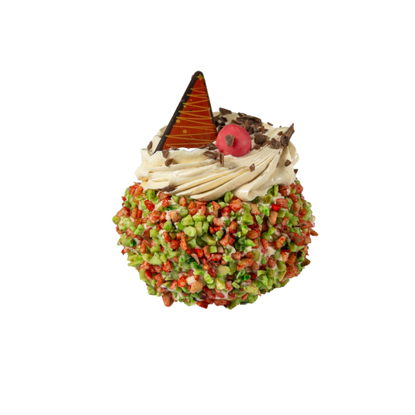 Schuimgebakje gevuld met luchtige hazelnootcrème en stukjes hazelnoot.