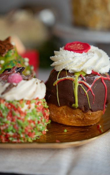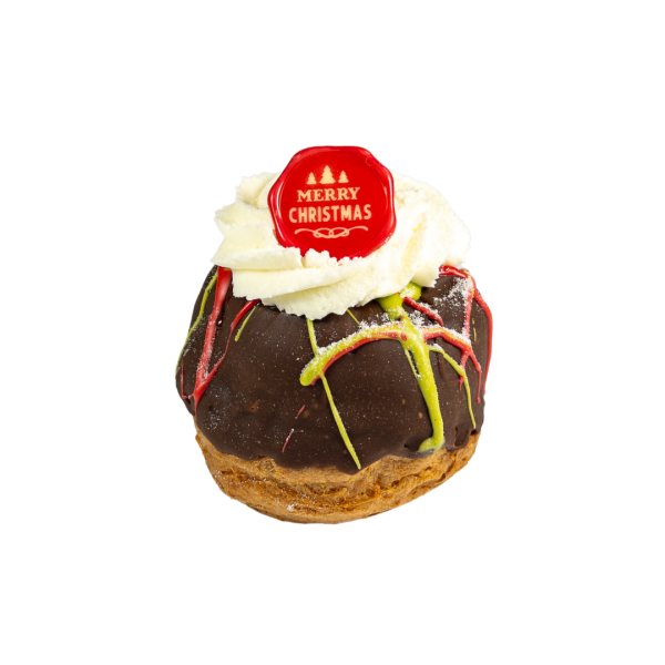 Onze morekop, maar dan in Kerst-uitvoering. Een soes, gedoopt in chocolade en gevuld met veel slagroom. Ten slotte gedecoreerd in Kerst-stijl.