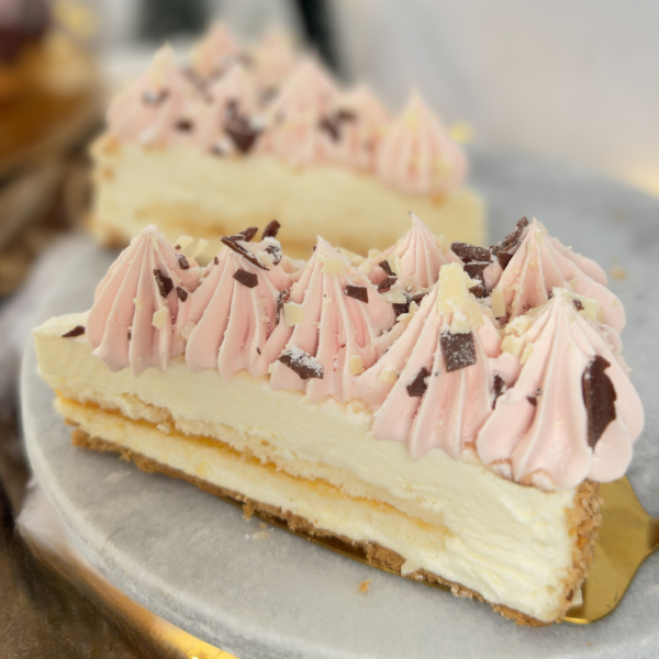 Onze naturel-kwarkpunt met een topping van Champagne-bavaroise. Versierd met chocoladekrullen.