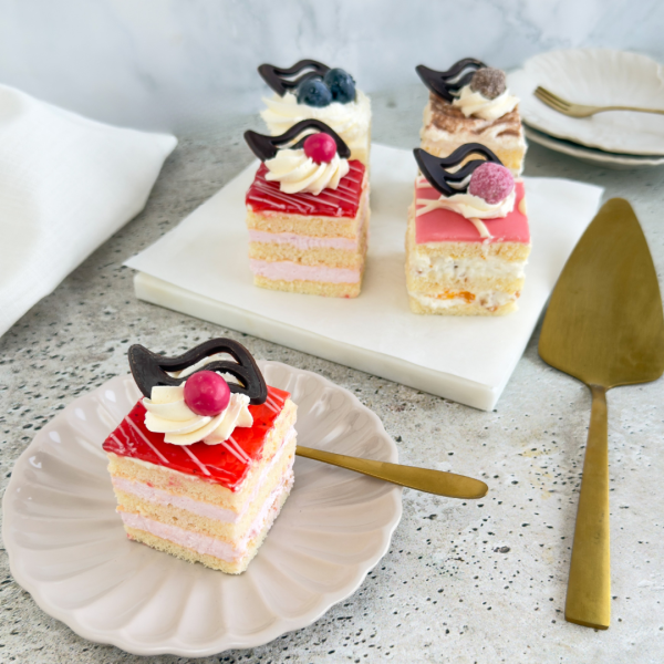 Gebak van luchtige cake met heerlijke vulling in verschillende smaken. De smaken zijn slagroom, aardbei, tiramisu en chipolata.