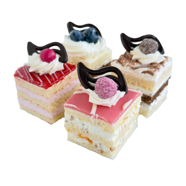 Gebak van luchtige cake met heerlijke vulling in verschillende smaken. De smaken zijn slagroom, aardbei, tiramisu en chipolata.