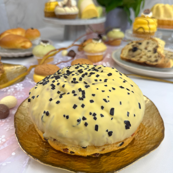 Rijk gevuld Paasbrood met bitterkoekjesspijs en gele chocodip. De bitterkoekjesspijs zit door het beslag gedraaid.